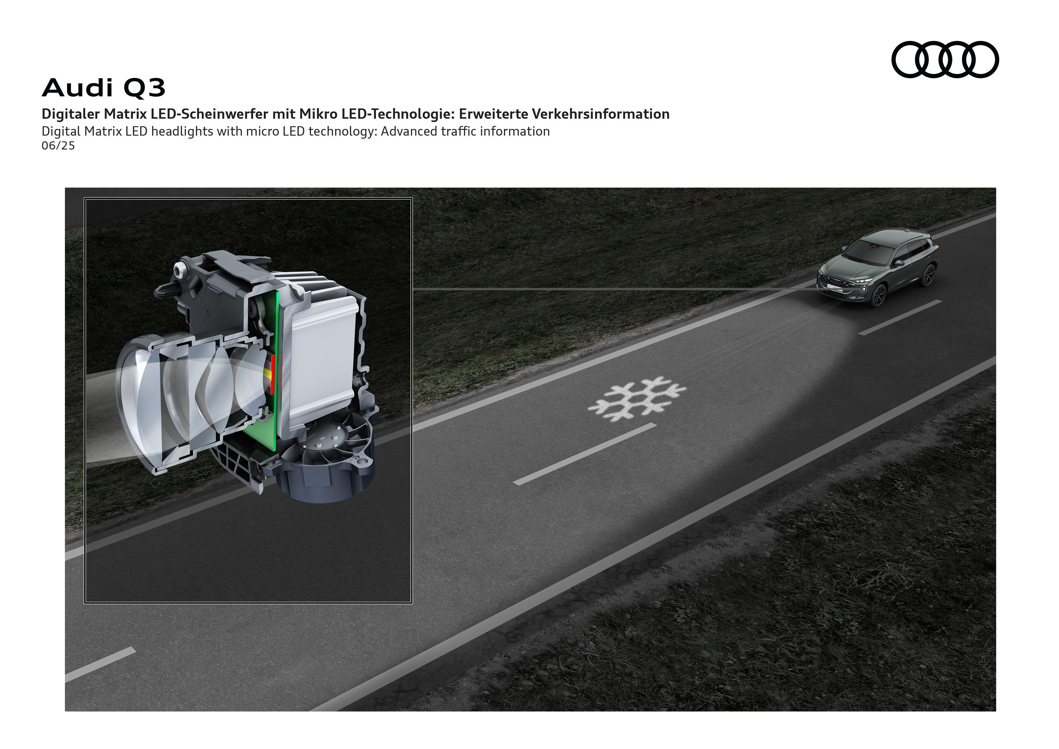 Een ander voordeel van de digitale matrix LED-koplampen in de nieuwe Audi Q3 is dat ze ook waarschuwingssymbolen kunnen projecteren. Als de buitentemperatuur bijvoorbeeld onder de vier graden zakt, projecteert het systeem een sneeuwvlok op de weg, precies hetzelfde symbool dat normaliter ook in het instrumentenpaneel wordt getoond. Zo weet de bestuurder direct wanneer het glad kan worden.