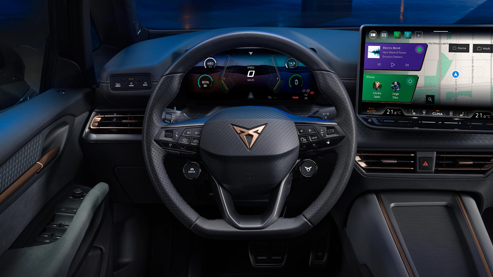 Het interieur van de nieuwe CUPRA Born ademt sportiviteit met standaard kuipstoelen en een flink grotere, 10,25 inch Digital Cockpit. Dit nieuwe, kristalheldere display biedt een indrukwekkend overzicht. Dankzij het sportstuur met fysieke knoppen en hoogwaardige koperen accenten is het CUPRA gevoel compleet.